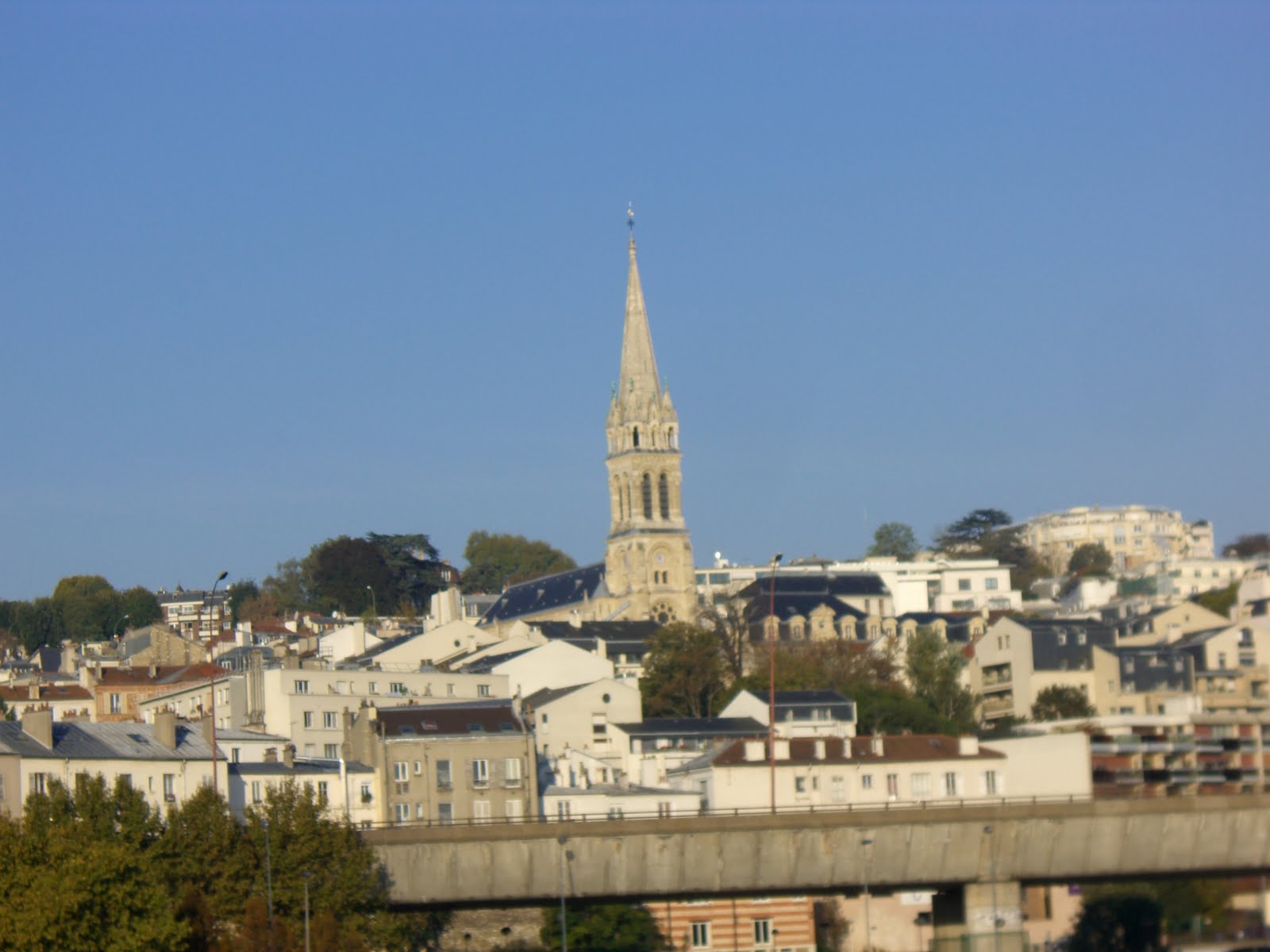 Le pont de l'A13 sur la Seine et au fond, l'église de Saint Cloud